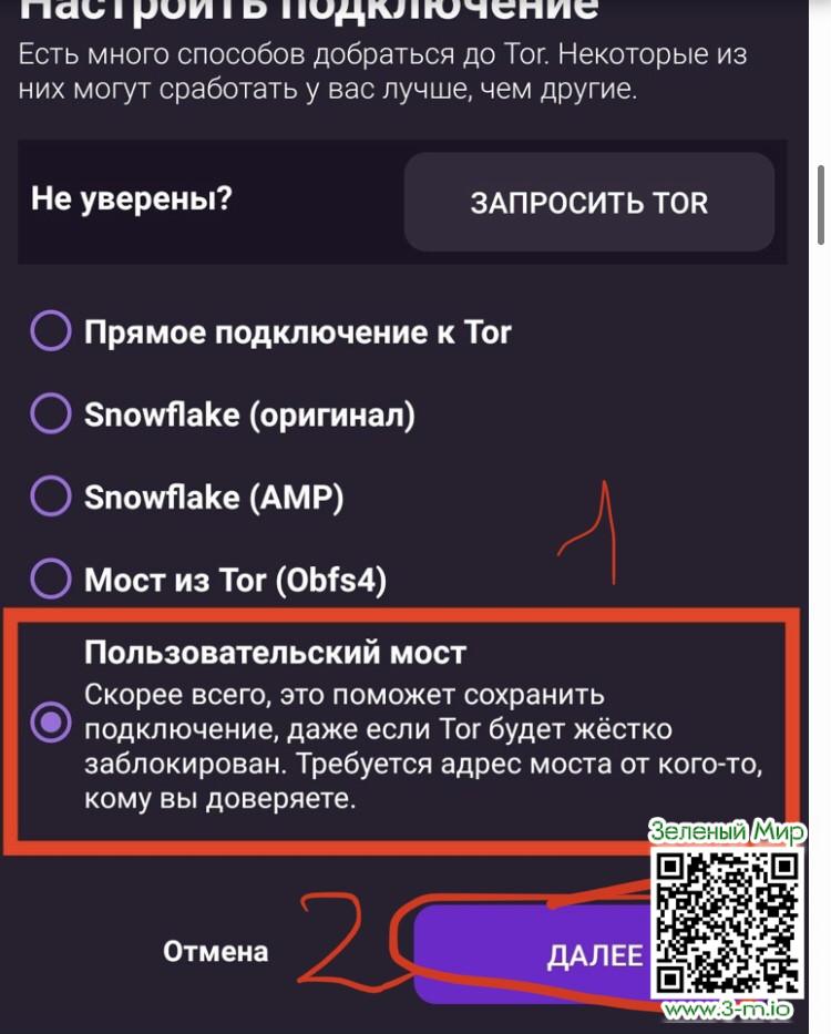 В окне, которое открылось вписываем мосты (мосты запрашиваем на офсайте Tor, то есть здесь: bridges.torproject.org).